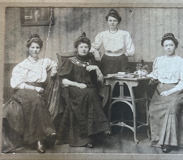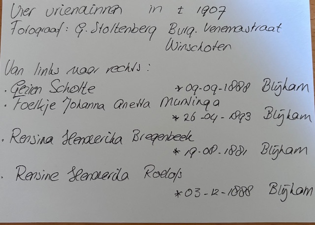 Op deze foto, gemaakt in ongeveer 1907 (door fotograaf G. Stoltenberg, Burg. Venemastraat in Winschoten) staan vier vriendinnen. Ik ben de kleindochter van Gezien Scholte, getrouwd met Siebold Roel Heslinga, hoofd der school in Ter Apel (Schotslaan).
