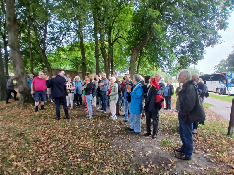 Zoals in de uitnodiging reeds stond, is het een excursie geworden met  een grote variëteit aan thema’s. We, een groep van ongeveer 60 deelnemers, vertrokken om half negen vanuit Onstwedde. Ons eerste reisdoel was Engerhafe. Onderweg werden we geconfronteerd met de grenscontrole bij Bad Nieuweschans. Deze verliep soepel en snel. Op onze eerste stop werd het verschil in thematiek al snel duidelijk. Aan de ene kant de donkere kant van de Duitse geschiedenis en aan de andere kant een 13 -eeuwse kerk. Wij werden door de vrijwilligers van de Evangelische-Lutherse kerk ontvangen voor de Kaffee und Küchen in het zalencomplex van de pastorie.