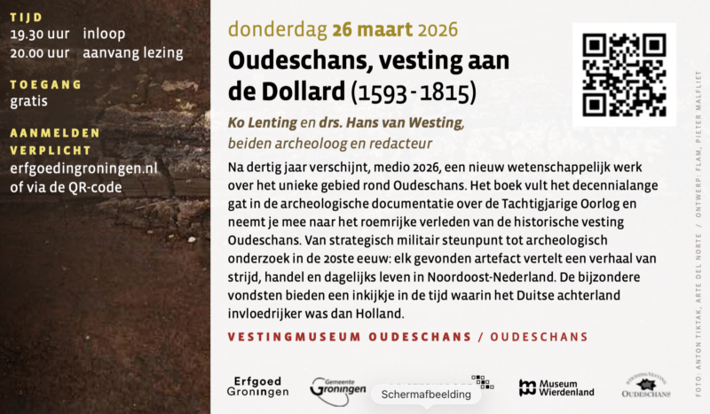 Lezing over Oudeschans, vesting aan de Dollard 26 maart a.s. Geplaatst op 11 maart 2026 door Website Beheerder N.B. Aanmelding is verplicht via Erfgoed Groningen of met de QR code.